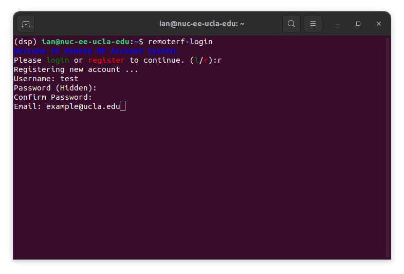 To begin using the SDRs connected to RemoteRF, you must download a package via pip and then create an account through a terminal interface.