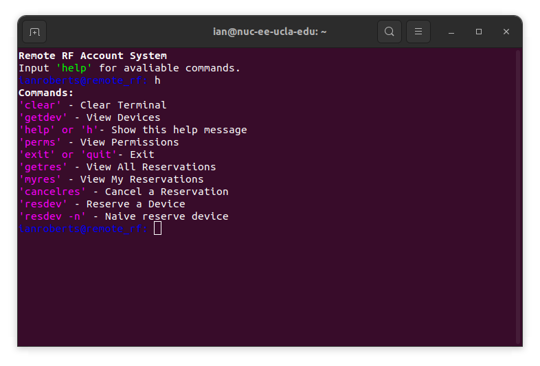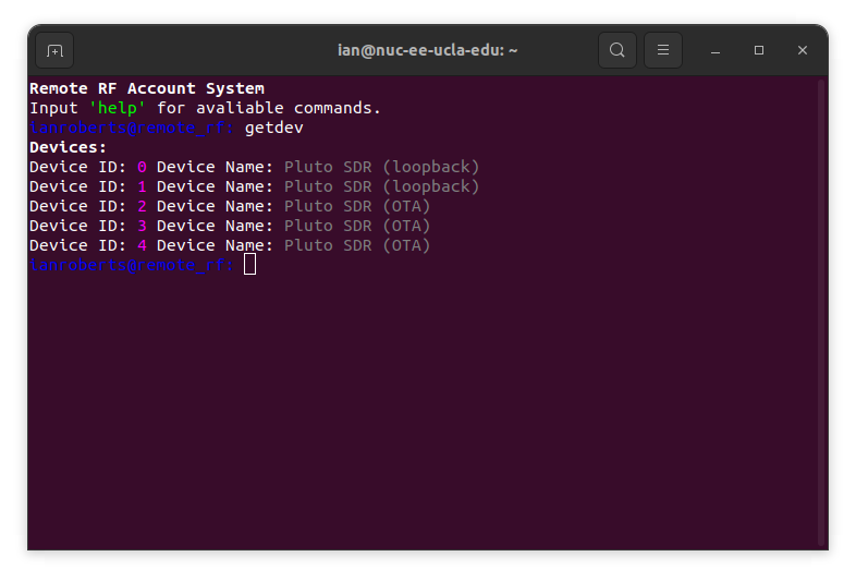 To see which devices are currently connected to the RemoteRF platform and functional, simply type getdev.
