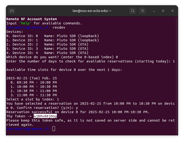 This token is used by the RemoteRF platform to validate your reservation and to route subsequent interfacing to the correct Pluto SDR corresponding to your reservation.