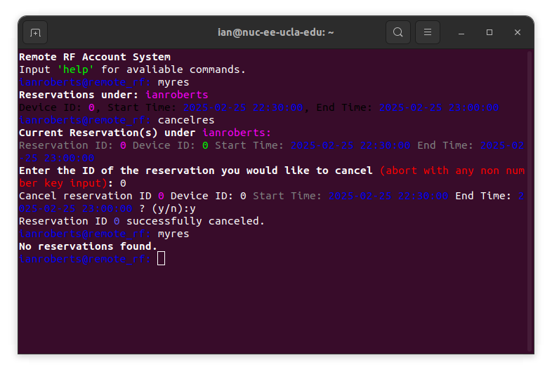 As illustrated below using the myres command to view active reservations, canceling a reservation amounts to simply indicating which of the listed reservations you wish to cancel.